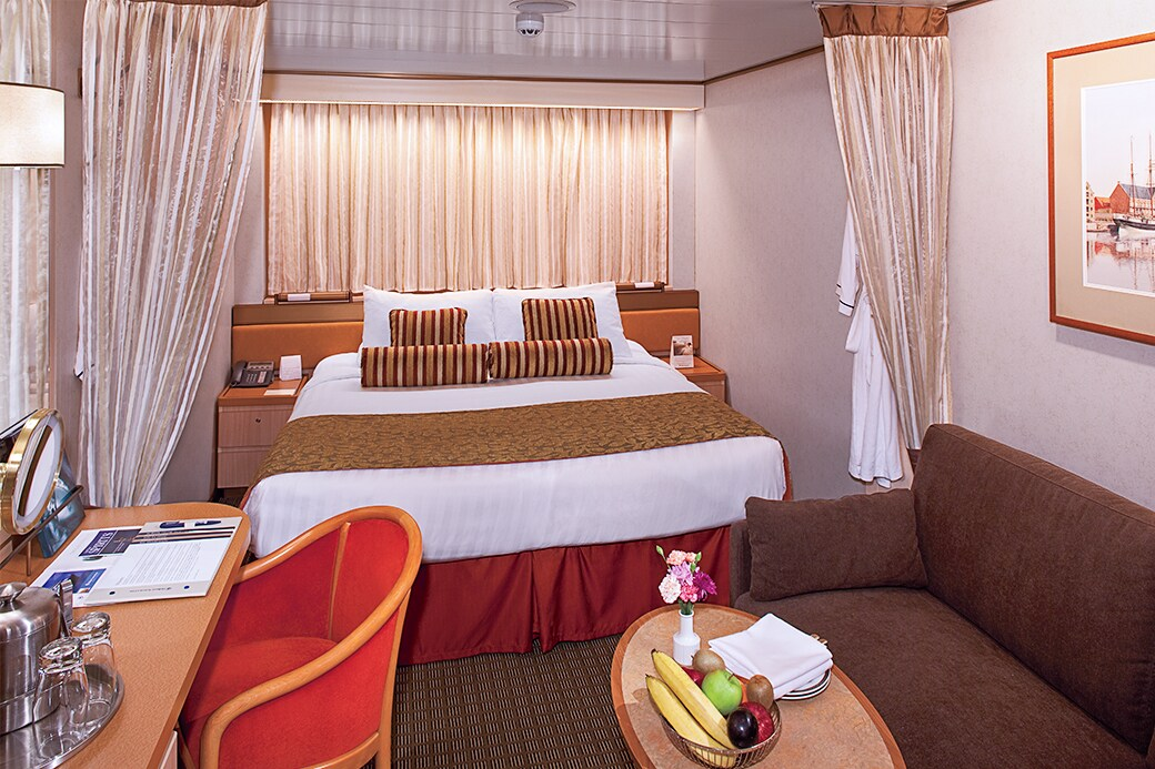 With floor-to-ceiling windows overlooking a private verandah, these spacious suites are flooded wit ... h light. They feature a large sitting area with a mini-bar and refrigerator, and two lower beds convertible to one king-size bed—our signature Mariner’s Dream™ bed with plush Euro-Top mattresses plus a separate dressing room. There’s also a sofa bed, suitable for two people. The bathroom comes with a full-size whirlpool bath and shower. Amenities include use of the exclusive Neptune Lounge, a private concierge and an array of complimentary services. The configuration of staterooms may vary from the images shown.