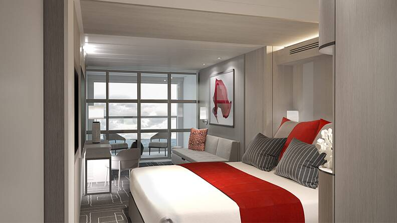 Take in the stunning views while you relax in your Ocean View Stateroom. Like all Edge Class Stater ... ooms, this stateroom is furnished with pure luxury in mind. From spacious living areas to the comfortable King-size Cashmere Mattress featuring eXhale bedding, you will feel right at home after your day of adventure. 200 sq ft.