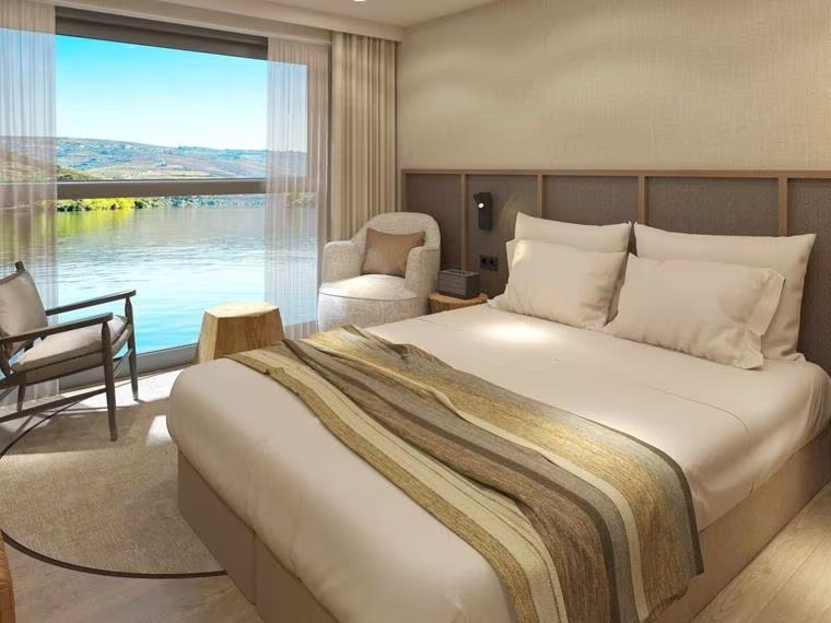 Wind through heavenly scenery and discover Portugal by river aboard a brand-new Travelmarvel river ship, the MS Estrela Cruise through the sun-kissed Douro Valley, visiting riverside villages and family-owned quintas. Experience life on board your brand-new river ship, the MS Estrela. Custom-built to cruise along the majestic Douro River, the MS Estrela has been designed to reflect the beauty of the region, with ample natural light and a distinctly Southern European ambience. Outdoor social spaces include a Sun Deck featuring a large swimming pool and an outdoor bar, plush lounge seats, sun beds and a putting green.Onboard entertainment includes Portuguese folk music and an informative history lesson.The main restaurant showcases Portuguese and international flavours, or you can opt for a lighter meal in the ship’s lounge, or dine alfresco.French Balcony suites feature an electric slide down window, allowing you to bask in the glorious landscapes.