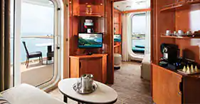 Perfect for the whole family, gather together and marvel at the unparalleled views from the aft-fac ... ing balcony. With room for five, these Suites include two separate bedrooms, one with a queen-size bed and one with a double sofabed, plus a single sofabed. Along with a luxury bath and living room to relax in. Plus they can connect to Aft-Facing Balcony staterooms so you can spread out yet enjoy the amazing views together. Butler and concierge service included.